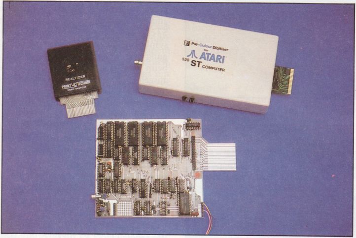 Fast so groß wie eine Zigarettenschachtel ist der ’Realtizer’ von Print Technik. Was sich in diesem engen Raum versteckt, ist durchaus erstaunlich. Der Digitizer wird, wie das Gerät von F.E.T., an den ROM-Port des ST angeschlossen, und die Versorgungsspannung wird ebenfalls vom Rechner geliefert. Eine an der oberen Seite angebrachte Cinch-Buchse bildet den Eingang des Videosignals. Hier kann, wie bei allen Digitizern, jede gewöhnliche Video-Quelle angeschlossen werden. Das Kabel wird nicht mitgeliefert, weil es in der Regel zum Lieferumfang jeder Kamera gehört. Die Einstellung von Kontrast und Helligkeit ist bei diesem Digitizer besser und bequemer gelöst. Man braucht keinen Regler, denn alles wird softwaremäßig eingestellt.