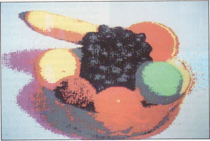 Der Digitizer von Print Technik kennt noch einen anderen Modus, um Farbbilder zu erzeugen. Er beruht auf der Tatsache, daß ein buntes Bild aus der Mischung der drei Grundfarben Rot, Grün und Blau entsteht. Mischt man die Einzelbilder, so entsteht ein Farbbild. Genauso wird es bei diesem Digitizer gemacht: Bei Verwendung eines Farbmonitors und mit dem mitgelieferten DIGICOL-Programm werden drei Bilder unter Zuhilfenahme von drei Farbfiltern (Rot, Grün und Blau) aufgenommen. Aus diesen drei Einzelkomponenten setzt der Rechner ein farbiges Bild zusammen. Man darf natürlich keine bewegten Objekte mit dieser Methode aufnehmen. Eine andere Einschränkung ist, daß diese Art von Digitalisierung nur in der niedrigsten Auflösung funktioniert: Eine ziemlich seltsame Methode, die sich aber als sehr sinnvoll und trickreich erwiesen hat.
