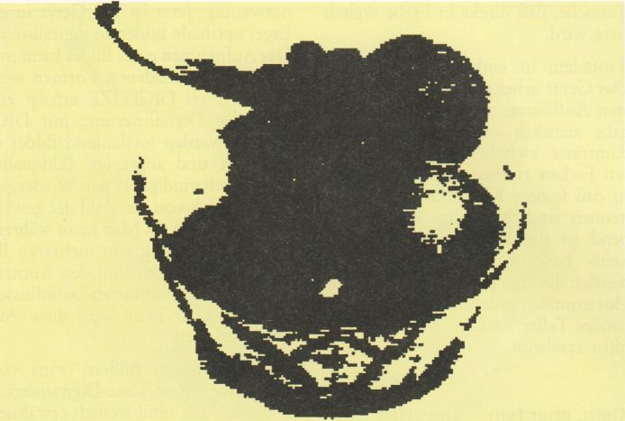 Eine der stärksten Seiten des Digitizers ist die Verarbeitung von Graustufen. Bis zu 16 verschiedene Grautöne lassen sich auf dem Bildschirm wiedergeben. Die Wiedergabe von Graustufen bewirkt einen fließenden Übergang von weiß bis hin zu schwarz, wodurch ein Bild einen weichen, fotoähnlichen Charakter bekommt. Bei einer Schwarz-Weiß-Digitalisierung ohne Erkennung von Grauwerten wird theoretisch jeder einzelne Pixel des Monitors entweder gesetzt oder nicht gesetzt. Beim Realtizer von Print Technik ist die maximale Auflösung jedoch immer eine 2x2 Matrix (vier Pixel), was einer Auflösung von 320x200 Bildpunkten entspricht. Um Grautöne auf einem Schwarzweiß-Monitor wiederzugeben, muß man sich verschiedene Muster schaffen, die aus mehreren Pixeln "bestehen. Dadurch entsteht zwar eine Verminderung der Auflösung (4x4 Matrix), der Gesamteindruck eines Bildes wird jedoch meist verbessert. Man kann in der Menüleiste zwischen vier verschiedenen Optionen wählen: Gar keine Grautöne (bedeutet schwarzweiß), vier, acht oder sechzehn. Erwähnenswert ist die Mühe, die sich der Softwarehersteller bei der Realisierung dieser
