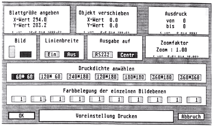 Die schönste Zeichnung nutzt nichts, wenn man sie nicht zu Papier bringen kann. Doch neben einer stattlichen Anzahl schon installierter Druckertreiber, wird auch die Anpassung jedes beliebigen Druckers/Plotters erklärt. Dem Ausdruck auf diesen Geräten ist jeweils eine Dialogbox gewidmet. Dort werden dann Blattgröße, Verschiebung, Zoomfaktor, Ausrichtung, Druckdichte und ähnliches eingestellt (siehe Bild). Außerdem ist es jetzt möglich einen bestimmten Ausschnitt auszugeben.