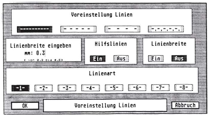 Der erste positive Punkt bei GFA DRAFT PLUS ist, daß es nur noch eine Menüzeile gibt und die Einstellungen jetzt in umfangreicheren Dialogboxen vorgenommen werden können. Damit ist es endlich möglich, Einstellungen auf eine akzeptable Art vorzunehmen. Nach dem Starten des Systems kann sofort mit dem Ziehen von Linien begonnen werden. Die Linienattribute (Typ, Breite, Art), werden in einem einzigen Menü eingestellt (das war nicht immer so einfach!). Allerdings zeigen sich schon hier erste Mängel. So beginnt die Linienbreite erst bei 0.3 mm, obwohl man bei jeder technischen Zeichnung eine Linienbreite von 0,25 mm benötigt. Als zweites wundert man sich über den Sinn der Linienarten. Diese können zwar eingestellt und benutzt werden, allerdings können oft benötigte Linieneinstellungen nicht abgespeichert werden. Laut Handbuch ist der Sinn dieser Option das spätere Trennen verschiedener Linien z. B. nach elektrischen und hydraulischen Leitungen.