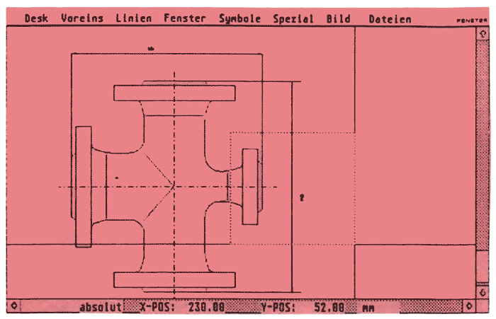Diese Funktionen sind beim Anfertigen von technischen Zeichnungen sehr wichtig. Zum Schraffieren ist im allgemeinen ein geschlossener Streckenzug notwendig, doch bei GFA DRAFT PLUS kann auch der Bereich zwischen zwei Linien mit einer Schraffur versehen werden. Auch das Bemaßen von Strecken ist recht einfach. Zuerst werden Maßhilfslinien gezogen, die sich ziemlich problemlos auf Linien einklinken. Zwischen diesen Hilfslinien wird dann der Bemaßungspfeil gezogen und mit einem weiteren Mausklick erscheint die Maßzahl. Dieses Verfahren ist zwar nicht das komfortabelste, aber es ist im Vergleich zur Handarbeit eine große Hilfe.
