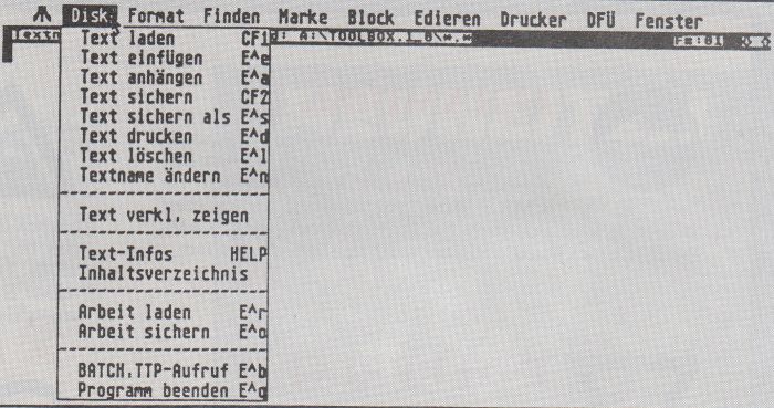Einen Bildschirmeditor, der sich durch seine Funktionalität von vielen anderen Produkten dieser Art abhebt. Ich meine damit, daß nicht nur die normalen Editorfunktionen wie Einfügen, Löschen, Blöcke verschieben usw. geboten werden, sondern zusätzlich noch ein Terminalprogramm enthalten ist, mit dem man seine Texte direkt über einen Akkustikkoppler oder ein Modem an eine Mailbox schicken kann.