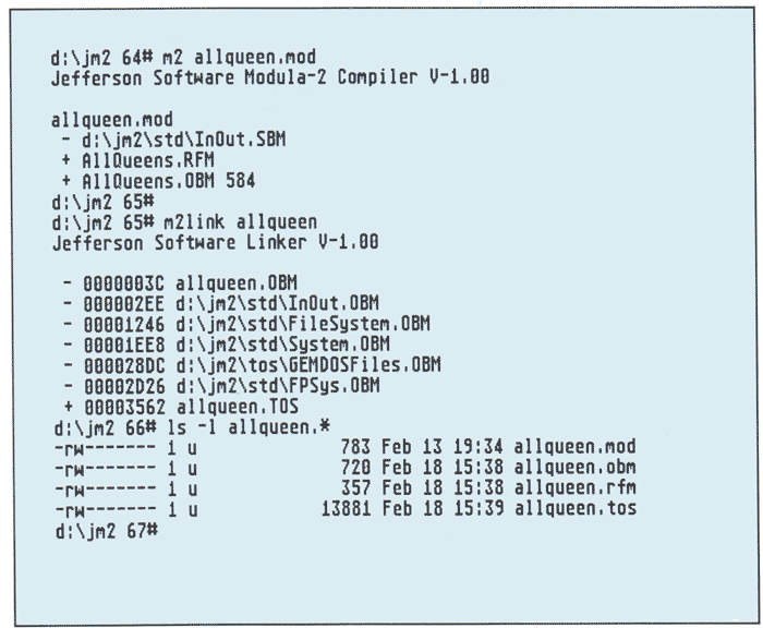 Bei umfangreichen Bibliotheken wächst der Verwaltungsaufwand auf den Massenspeichern enorm an. Hat man 50 Module, so entstehen bei getrennten Symbol- und Linkdateien schon 1 OOFiles, die im Zugriff sein müssen. Schon jetzt ist die Arbeit mit nur einem Diskettenlaufwerk praktisch unmöglich, richtig komfortabel wird’s erst mit Festplatte. Vielleicht sollten Implementierungen auf dem ST ein gepacktes Libraryformat verwenden, wie es auch auf Großrechnern zu finden ist. Alle Standardmodule gepackt in eine Datei STANDARD.LIB mit einigen simplen Zugriffsmechanismen für Compiler und Linker, und schon wäre Benutzern mit Diskettenlaufwerken erheblich geholfen.