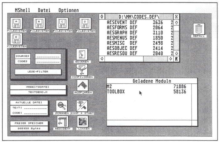 Da sich kein System als in allen Bestandteilen optimal bezeichnen läßt, möchte ich noch kurz das ultimative Modula-System für den ST skizzieren. Zusammenkommen müßte eine Oberfläche wie bei Megamax, die erheblich mehr kann, als nur einen komfortablen Wechsel zwischen den Paket-Bestandteilen zu ermöglichen. Dazu käme ein Compiler, der schnell läuft und einen Code wie Softwave oder SPC liefert.