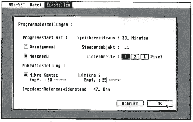 Das AMS-Software-Paket beinhaltet ein SETUP- und das eigentliche Meßprogramm. Beide Programme sind in GFA-BASIC geschrieben und voll in GEM eingebunden. Im SETUP können sämtliche Voreinstellungen wie spezielle Mikrofondaten (Feldübertragungsfaktor), Meßarten, Hardware-Konfigurationen und Druckersteuerungen vorgenommen werden (Abb. 1). Die Kalibrierung des Meßprozessors sowie von dessen Hardware-Erweiterungen läßt sich von hier aus durchführen. Weiterhin ist es möglich, mehrere SETUP-Dateien abzuspeichern.