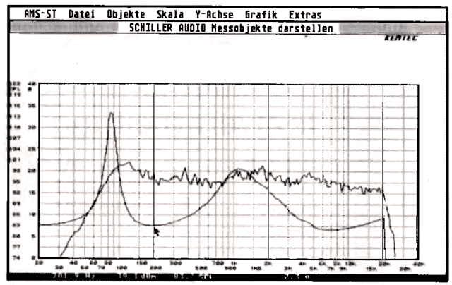 Für die genauere Darstellung von Meßobjekten und deren Auswertung ist das Anzeigemenü zuständig. Mit der Lupenfunktion können bestimmte Teile einer Kurve mehrfach vergrößert werden. Fährt man mit dem Maus-Cursor auf einer Kurve entlang, werden die Frequenz und der dazugehörige Funktionswert zusätzlich digital angezeigt. Alle Messungen lassen sich miteinander verrechnen (Summen- und Differenzbildung, arithmetische Mittelung). Zusätzlich wurde softwaremäßig das nach DIN IEC 651 genormte Filter für die A-Bewertung installiert. Somit ist es möglich, den gemessenen Schalldruckpegel in Abhängigkeit von der Frequenz unterschiedlich zu bewerten, was in erster Näherung unserem Gehör entspricht. Oftmals kann es sinnvoll sein, mehrere Kurven mit unterschiedlichen Meßgrößen in einem Diagramm darzustellen. Dieser Fall trifft bei Messungen von Lautsprecherboxen zu, bei denen es von Interesse ist, Pegel- und Impedanzfrequenzgang gleichzeitig zu betrachten. Folglich wird die y-Achse in dBspl und Ohm skaliert (Abb. 3).