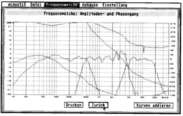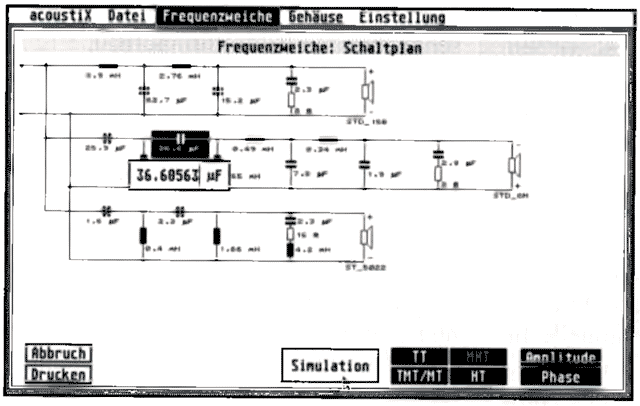 Zur Berechnung kompletter 2-, 3- und 4- W eg-Frequenzweichen lassen sich Filter von 1.-4. Ordnung mit Butterworth-, Bessel-, Tschebyscheff-, Linkwitz- und Compromise-Charakteristik vorgeben. Für jedes der Hoch-und Tiefpaßfilter können Sie Trennfrequenz, Filterordnung und - Charakteristik getrennt wählen. Als Ergebnis wird dann der Schaltplan ausgegeben (Abb. 6). Die Schaltplanbauteile können nun ggf. vom Anwender modifiziert werden. Bei der Simulation (Abb. 7) kann man zur besseren Übersicht die Darstellung auch nur auf Amplitude oder Phase der einzelnen Wege beschränkten. Trotz des großen Rechenaufwandes konnte eine hohe Arbeitsgeschwindigkeit erreicht werden; die Simulation der kompletten 3- Weg-Weiche in Abb. 7 benötigte nur ca. 11 Sekunden.