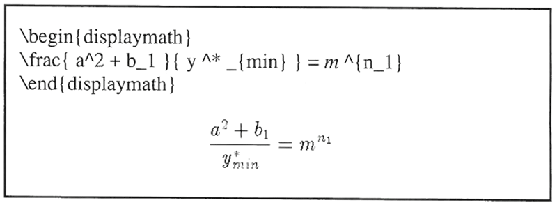 Wie schon erwĂ€hnt, erstellt man seinen Text im ASCII-Format und lĂ€Ăt ihn dann von TeX in das gewĂŒnschte Dokument ĂŒbersetzen. Um dem Programm mitzuteilen, welche Textabschnitte als Formel gesetzt werden sollen, schlieĂt man sie in sog. Umgebungen ein. Dies erreicht man z.B. mit den Befehlen: