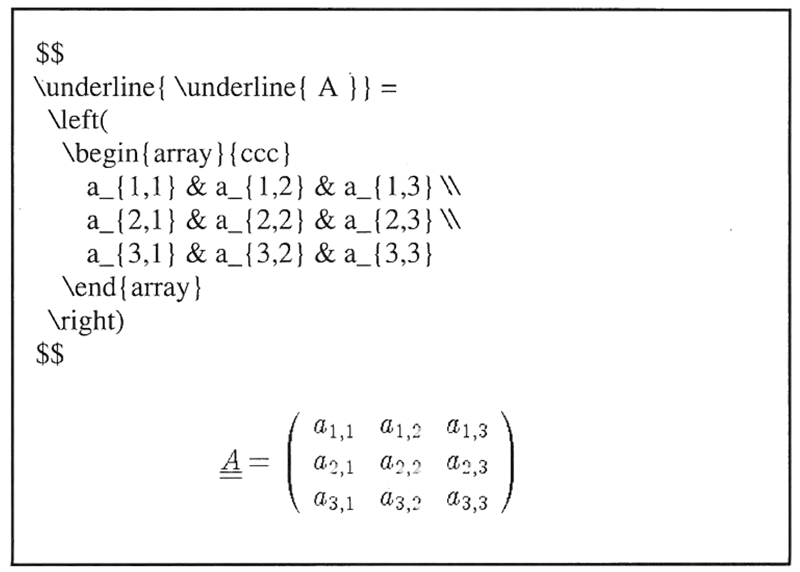 In Beispiel 5 möchte ich noch zeigen, wozu eine geschachtelte âarrayâ-Umgebung in der Lage ist. Die Befehle â\left(â und â\right)â sorgen ĂŒbrigens fĂŒr die runden Klammern in der richtigen GröĂe.
