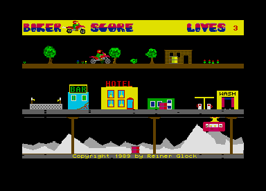 Im Straßenverkehr dürfen Sie sich so nicht erwischen lassen: Von Ihrem Joystick gesteuert donnern Sie mit einer starken Enduro-Maschine durch eine kleine Stadt, vorbei an Bar, Hotel und Waschstraße. Dort haben Sie allerdings weniger die Pixelpolizei zu fürchten als die Hindernisse und Überraschungen, die Reiner Glock dort eingebaut hat (ST-PD 290).
