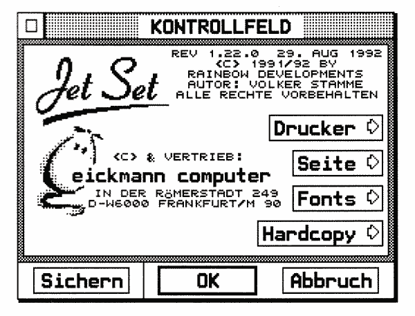 Das Etiketten-Druckprogramm aus der Public-Domain-Sammlung oder die FIBU, sie bleiben außen vor. An dieser Stelle kommt Jet Set zu Hilfe. Jet Set ist ein äußerst nützliches Hilfsmittel, das Ausgaben auf die parallele Schnittstelle abfängt und auf den DMA-Laser umlenkt.