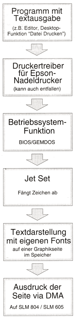 Nun ist es ja nicht so, daß die Idee so unbedingt bahnbrechend neu wäre. Nein, ATARI hat es sogar selbst erkannt, als sie den SLM 804 seinerzeit in die Computerläden stellten. Damals hatte das allerdings noch andere Gründe: Es gab schlicht und einfach kein einziges Programm, das den Laser über DMA bedienen konnte. Die Lösung damals hieß Diabolo-Emulator. Das Programm arbeitet genauso wie Jet Set, emuliert allerdings einen Typenraddrucker. Die zweite Lösung heißt Laserbrain. Dieses Frühwerk von DMC erfüllt seine Aufgabe auf dem gleichen Weg wie Jet Set, hat allerdings den gewaltigen Nachteil, ständig einige hundert KB an Speicher zu benötigen. Beide Programme liefert ATARI seit Jahr und Tag mit den SLM-Druckern aus (siehe auch [1]).