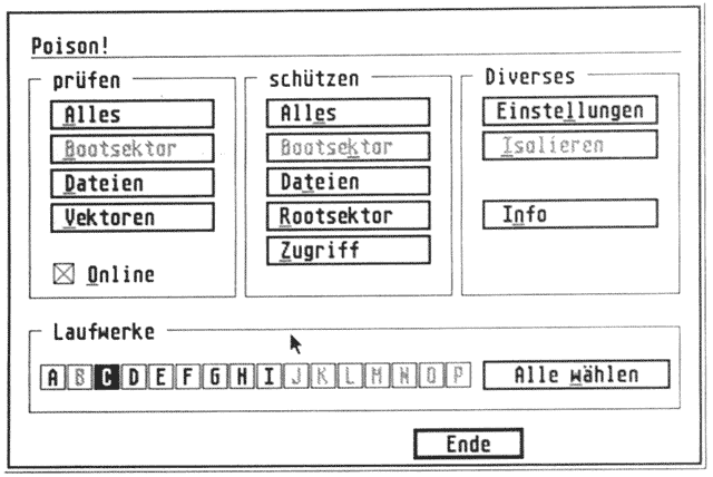Dieses Programm im Vertrieb von Shift ist voll in GEM eingebunden und benutzt die MagicDials (Zugabe vom RCS Interface der gleichen Firma). Dementsprechend ist das Programm einfach zu bedienen. Poison kann als normales Programm oder auch als Accessory betrieben werden, wobei letzteres eine Online-Prüfung erlaubt. Allerdings wird "nur" der Boot-Sektor überwacht. Ein zusätzlicher Schutz gegen Link-Viren wird hiermit nicht erreicht.