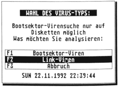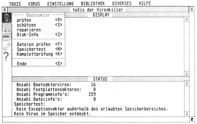 Hier macht sich auch ein großer Unterschied bemerkbar: toXis geht einen vollständig anderen Weg der Bedienung. Im Menü Viren findet man allerlei Funktionen zum Aufspüren von Viren. Der Boot-Sektor einer Diskette läßt sich auf Virenbefall hin prüfen, schützen und reparieren. Auch toXis schützt Boot-Sektoren, indem es dort ein kleines Programm unterbringt, das beim Booten eine Meldung ausgibt. Erscheint diese Meldung nicht, ist der Boot-Sektor mit größter Wahrscheinlichkeit infiziert.
