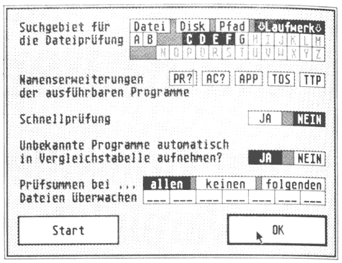 In Bild 1 ist der Dialog wiedergegeben, von dem aus alle Funktionen des Programmes zugänglich sind. In der Box prüfen finden sich alle Möglichkeiten, den Datenbestand auf Viren zu überprüfen. Wie sicherlich bekannt, gibt es unterschiedliche Arten von Viren entsprechend der vielfältigen Methoden der Überprüfung.
