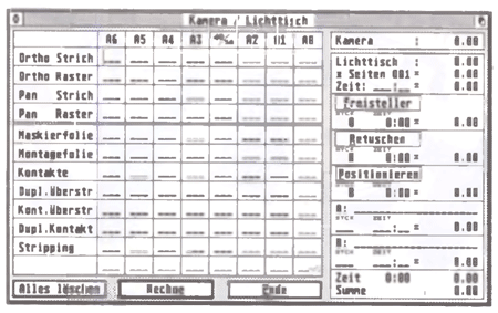 Bild 4: Das Formular „Kamera/Lichttisch“ beinhaltet eine modifizierte Tabellenkalkulation für die traditionelle lithografische Produktionstechnik. Die Arbeits- und Materialbezeichnungen in der Tabelle können, wie auch der Menü-Eintrag selbst für den eigenen Bedarf frei belegt werden.