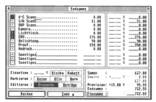 Die Probleme beginnen aber im allgemeinen dort, wo die Kreativität beginnt und noch keine oder nur wenig eigene Erfahrungen vorhanden sind. Wie erfasse ich da den Aufwand einer Arbeit für den Kostenvoranschlag, wenn ich diesen Aufwand erst nach Fertigstellung der Arbeit kenne, wie z.B. bei einer Logogestaltung? Dieses kann natürlich keine Software lösen. Wohl aber kann sie Hilfestellung leisten bei der Kalkulation einzelner Tätigkeiten im Bereich der Druckvorstufe.