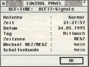 Zum Lieferumfang gehören neben dem Wecker und dem Handbuch noch eine Diskette, auf der sich ein kleiner Autoordner befindet und ein CPX-Modul für das Kontrollfeld. Das CPX-Modul ist Freeware und stammt von Ralf Zimmermann aus Wiesbaden. Man kann die Einstellungen der Uhr verändern und sichern. Alles in allem eine sehr schöne saubere Lösung, die uns gut gefallen hat. Der Wecker und die Anbindung an den ATARI kosten insgesamt 129- DM.