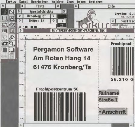 Tarkus LT bietet alle Funktionen der Tarkus 2.1-Version. Zusätzlich istTarkus LT in der Lage Postfrachtidentcodes und Postfrachtleitcodes auszugeben. Durch diese Vorleistung können Postfrachtversender Portokosten sparen. Tarkus LT kostet 198,- DM. Update von Tarkus 2.1 nach LT: 59,- DM.