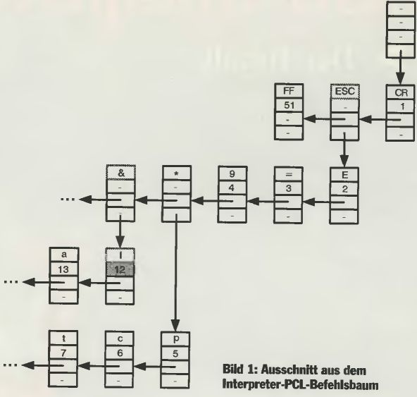 Dazu vielleicht das Beispiel in Bild 1: Angenommen, die Zeichenfolge ESC, &, I (ein Befehl zum Einstellen des Seitenlayouts) soll interpretiert werden: Der Interpreter beginnt immer bei einem speziellen Knoten TopElem und liest das erste Zeichen (ESC). Von TopElem hangelt er sich dann über den Zeiger in FirstElemNextLine zum ersten Knoten, mit dessen Zeichen (Carriage return) verglichen wird. Da die beiden Zeichen nicht übereinstimmen, geht’s über NextElemlnLine zum nächsten Knoten in der Ebene. Dieser enthält das gesuchte Zeichen - aber keine Befehlsnummer, der Befehl ist noch nicht zu Ende. Der Interpreter liest also das nächste Zeichen (&) und sucht im Zeiger FirstElemNextLine den ersten Knoten der nächsten Ebene. In dieser Ebene gehts es dann solange über NextElemlnLine weiter, bis das Zeichen in einem Knoten gefunden wird. Auch dieser Knoten hat noch keine Befehlsnummer. Deshalb wird ein weiteres Zeichen gelesen (I) und mit den Knoten der nächsten Ebene verglichen. Der passende Knoten enthält jetzt eine Befehlsnummer. Der Befehl ist daher vollständig erkannt. Allerdings können diesem Befehl jetzt noch Argumente folgen. Das ist dann in der Struktur-Liste PcIBefehle vermerkt. Diese Argumente bestehen ausschließlich aus Ziffern oder Vorzeichen und werden durch einen Buchstaben abgeschlossen. Falls ein solches Argument folgt, wird es und sein Terminator noch aus dem Datenstrom gelesen.