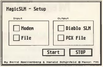 Wählen Sie das Accessory im Menü an. Nun können Sie wählen, ob Sie Daten über die serielle Schnittstelle empfangen oder eine bereits vorliegende PCL-Datei umwandeln wollen. Außerdem können Sie den Output auf den SLM-Laserdrucker oder in PCX-Files leiten. Dann Wählen Sie .Start“ oder brechen das Programm mit "Stop“ ab.