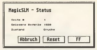 Während der Wandlung öffnet sich der Statusdialog, und Sie haben folgende Möglichkeiten: "Abbruch“ unterbricht die Wandlung, und MagicSLM gibt die Schnittstelle wieder frei und legt sich wieder schlafen. "FormFeed“ führt einen Seitenvorschub aus. Die Wandlungs-Buffer werden neu initialisiert, und die Wandlung wird fortgesetzt. .Reset“ initialisiert die Wandlungs-Buffer, ohne sie zu drucken, und die Wandlung wird weitergeführt.