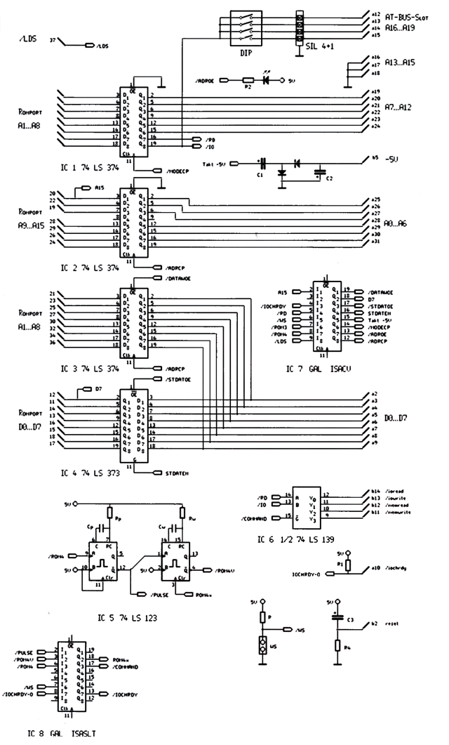 Am ROM-Port ist eine reduzierte Anzahl Signale des 68000-Prozessors vorhanden, eigentlich nur die für eine EPROM-Karte unbedingt notwendigen. Es fehlen zum Beispiel Adreßleitungen, die durch zwei ROM-Selects ersetzt wurden. Damit ist der Adreßraum auf zwei aufeinanderfolgende 64KB-Blöcke beschränkt. Des weiteren fehlt die Read/Write-Leitung, so daß man eigentlich nicht in den ROM-Port-Bereich schreiben kann [3]. Dies ist das erste Hindernis, welches zu überwinden gilt. Der ROM-Port hat außerdem die Besonderheit, daß seine Zugriffsdauer immer gleich lang ist. Er wartet auf Daten, und wenn diese Zeit um ist, müssen die Daten an den Datenleitungen anstehen. Der „Lieferant“, seien es nun Eproms oder Netzwerkkarten, muß also innerhalb dieser Zeit (~300ns) merken, daß ein Zugriff geschieht, die Adreßleitungen auswerten, verarbeiten und das Ergebnis auf die Datenleitungen legen. Das ist, insbesondere für eine ISA-Bus(PC-)-Karte, oft zuviel verlangt. Schaut man sich so einen ISA-Bus mal etwas näher an, fallen einem mehrere Unterschiede zum ATARI-Bussystem auf: Er hat getrennte Read- und Write-Enable-Leitungen, mehrere unterschiedliche Zugriffsarten und eine Adressierungsunterteilung in Speicher- und I/O-Bereich. Die Zyklen sind teilweise variabel und haben keine feste Zeitdauer, in denen sie beendet sein müssen (async. Bus).