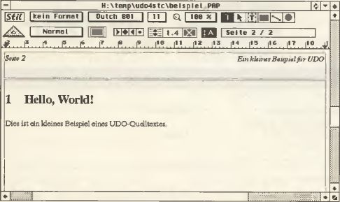 Da die Bedienung der Programme (GEM- und Kommandozeilenversion) ziemlich trivial ist, möchten wir uns hier näher mit dem U DO-Format befassen. UDO erwartet Textdateien, die mit speziellen Kommandos angereichert sind, die stark an die Befehle von LaTeX und des HCP (des Hypertextcompilers des ST-Guide) erinnern. Diese Quelltexte lassen sich also mit jedem gebräuchlichen Editor(z.B. Everest, 7up, JAnE, qed) erstellen.