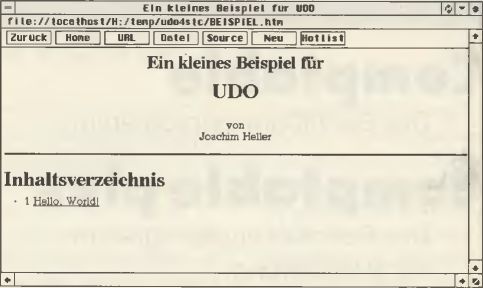 Da UDO auch für andere Betriebssysteme (Linux, HP-UX, MacOS, MS-DOS, Sl-NIX, Sun Spare ...) erhältlich ist, könnten Texte mit allgemeinem Inhalt auch als Quelltext weitergegeben werden, so daß Benutzer von UDO, die keinen TOS-Rechner besitzen, auch in den Genuß so mancher Information im gewünschten Format kommen können. UDO hält in der derzeit erhältlichen Version über 100 Befehle bereit, mit denen man einen Quelltext „programmieren“ kann. Allerdings braucht man für die Erstellung eines kleinen Textes lediglich ein paar Befehle zu kennen. Daher hier eine Minimalversion eines Quelltextes, der eine Titelseite, ein Inhaltsverzeichnis und ein Kapitel enthält und mit lediglich 8 Befehlen (UDO-Befehle beginnen mit einem Ausrufungszeichen) erstellt wird:
