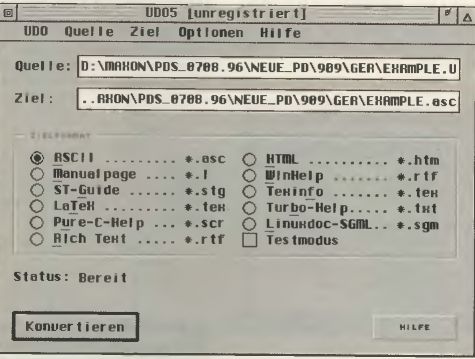 UDO steht als Abkürzung für „Universal Document“ und ist zugleich die Bezeichnung eines neuen Textformates und des zugehörigen Programms, das eben dieses UDO-Format wahlweise in eines der folgenden Formate umwandeln kann: ASCII, ST-Guide, Pure-C-Help, LaTeX 2.09 oder LaTeX2e, Rieh Text Format (RTF), Flypertext Markup Language (HTML), Manualpage, GNU-Texinfo, Windows-Help, Turbo-Vision-Help und Linuxdoc-SGML.