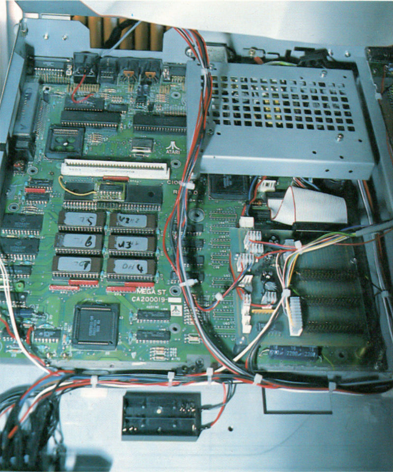Das Multiboard mißt über zwei Thermosensoren die Temperatur im Innern des Gehäuses. Der Lüfter (natürlich verwendet man den leiseren Festplatten-Fan und nicht den winzigen Mega-ST-Heuler) arbeitet normalerweise mit minimaler Drehzahl. Erst wenn die Innentemperatur steigt, erhöht er seinen Luftdurchsatz, um dann bei 40 Grad Celsius mit voller Leistung zu röhren. Steigt die Temperatur noch weiter an — was eigentlich nicht Vorkommen sollte — leuchtet eine rote Alarm-LED am Frontpanel auf und ein Piepston. warnt vor Überhitzung. Ein kleines Batteriefach für zwei 1,5-V-Zellen nimmt die Stromversorgung für die Uhr auf.