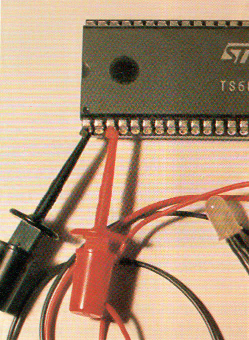 Ein Wort zur »lötfreien« Konstruktion: Lighthouse liefert alle Drahtverbindungen zu Schaltern und LEDs fertig gelötet und mit Schrumpfschlauch isoliert. Die Kabel enden entweder in Lüsterklemmen (müssen also abisoliert werden) oder in feinen Greifklemmen (s. Abb.), die an die Beinchen von ICs oder Kondensatoren etc. angebracht werden. Löten ist tatsächlich nirgends unbedingt erforderlich und die liebevoll bebilderte und ausführliche Umbauanleitung dürfte alle Unklarheiten aus dem Weg räumen. Trotzdem bieten solche Greifklemmen nun einmal längst nicht die Sicherheit von Lötverbindungen: Sie können oxidieren oder abrutschen und provozieren Wackelkontakte. Besonders kritisch ist die Geschichte am Floppycontroller WD1772: Hier muß Pin 18 durchtrennt und mit einem Draht zum Octobus verbunden werden. Wer die Möglichkeit hat, sollte solche wichtigen Kontaktstellen unbedingt löten, denn es gibt nichts ärgerlicheres als ein Wackler mitten in einem Schreib-/Lesevorgang...