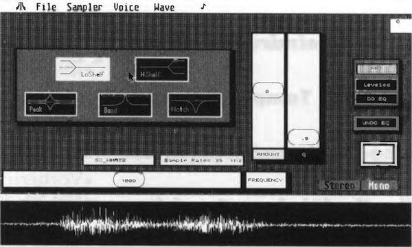Über den Menü-Punkt »Equalizer« gelangen Sie zur Filter-Page des Programms. Zwar finden Sie hier keinen Equalizer im eigentlichen Sinne, dafür bietet Ihnen GenWave fünf verschiedene Filtertypen zur Bearbeitung des Klangmaterials. Dazu gehören Hoch-, Tief- und Bandpass sowie Bandsperre. Der fünfte Filtertyp »Peak« ähnelt in seiner Arbeitsweise stark einer parametrischen Klangregelung und beansprucht die meiste Rechenzeit von allen Filtern. Ungefähr 30 Sekunden benötigt GenWave, um ein ca. 65 KByte großes 16-Bit-Sample mit Peak zu bearbeiten. Je nach Filtertyp lassen sich die Parameter Filterfrequenz, Bandweite und Filterstärke per Schieber den jeweiIigen Erfordern issen an passen. Ein erstauntes »Oh!« kam dem Tester über die Lippen, als er auf der Equalizer-Page einen Button mit der Aufschrift »FFT« erspähte. FFT ist die Abkürzung für »Fast Fourier Transformation«, einem mathematischen Verfahren, das einen Klang in seine einzelnen Sinusschwingungen zerlegt und so Aufschluß über die Frequenzverhältnisse innerhalb eines Sounds gibt.