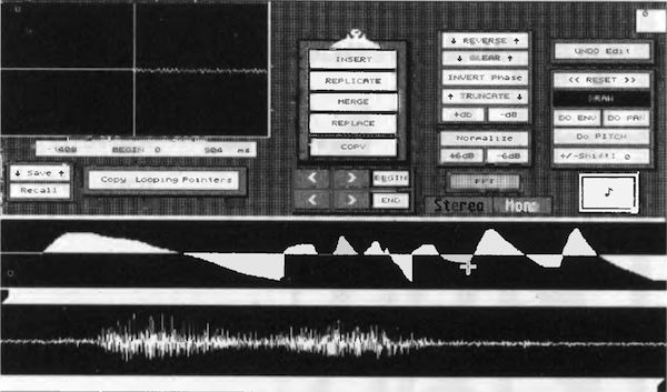 Besonders interessant für Klangbastler ist die FFT dann, wenn das Programm ein solches Frequenzspektrum direkt manipuliert und anschließend wieder in ein normales Sample zurückrechnet (Re-synthese). GenWave beherrscht die hohe Kunst der Resynthese leider nicht, die FFT dient nur zur Analyse von Sounds. Aber auch diese Aufgabe erfüllt das Programm bisher nicht optimal. Zwar sind die Rechenzeiten (Auflösung: 128 Slices) akzeptabel, doch ist der anschließende Grafikaufbau zu langsam. Auch läßt sich der »Blickwinkel« auf die Grafik nicht verändern. Dafür gestattet GenWave das Zoomen einzelner Frequenzbereiche. Operationen wie Samples schneiden, mischen, invertieren und Pegel korrigieren erledigen Sie bequem in der »Envelope Page«, die in ihrem Aufbau der Looping-Page ähnelt. Inder »Draw Area« direkt über dem »Overview Display« lassen sich per Mauszeichnung Effekte wie Tonhöhenänderungen, Stereo-Panning und Hüllkurven korrek-tur erzielen. Die X-Achse entspricht dabei der Länge des Samples, die Bedeutung der Y-Achse ändert sich gemäß der angewählten Funktion: Beim Stereo-Panning stehen positive Y-Werte für »links«, negative Y-Werte für »rechts«.