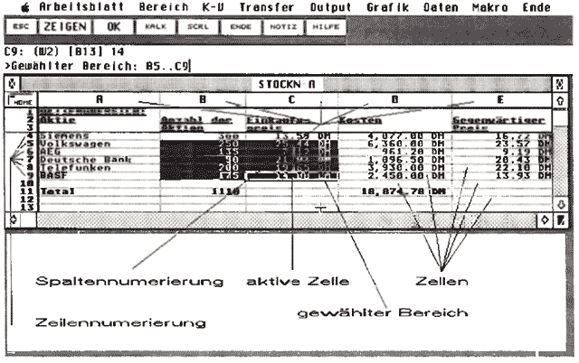 Die Zelle ist der elementare Teil einer Tabelle, der sich nicht aufteilen läßt. Der Zellzeiger ist meist ein schwarzer Balken, der die aktive Zelle anzeigt. In der aktiven Zelle können Sie Daten eingeben oder ändern. Mehrere Zellen zusammen ergeben einen Bereich. Diesen Bereich können Sie kopieren, verschieben oder löschen. Auf Bereiche können Sie auch Operationen anwenden, die sonst nur mit dem gesamten Arbeitsblatt möglich sind. Man kann Bereiche schützen oder alle Formeln eines Bereiches rechnen lassen und die Ergebnisse in die Tabelle eintragen.