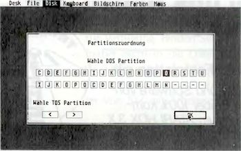 Nun präsentiert sich auch das Installationsprogramm des AT-Speed im schicken GEM-Gewand: Unsere Hardcopy [rechts oben] zeigt die bequeme Zuordnung der TOS-und DOS-Partitionen per Maus.
