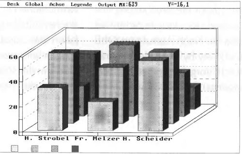 Sollten Sie mit einem HP-Taschenrechner groß geworden oder FORTH-Freak sein, dann ist Ihnen die »Umgekehrte polnische Notation« (UPN) in Fleisch und Blut übergegangen. BASiCHART unterstützt diese Form. Benötigen Sie eine ausgefallene Einheit hinter den Zahlen (vielleicht Bq), legen sie diese selbst fest. Die Druckerausgabe ist, wie unter »1st Word Plus«, sehr einfach über eine Druckdatei geregelt.Mit dem Grafikteil stellt sich BASiCHART neben Beckercalc und LDW 2.0. Es setzt neue Akzente, beispielsweise durch freie Wahl der Tiefe für die 3. Dimension. Ein eigenes Grafikmenü erlaubt eine Vielzahl von Eingriffen in die Grafik.