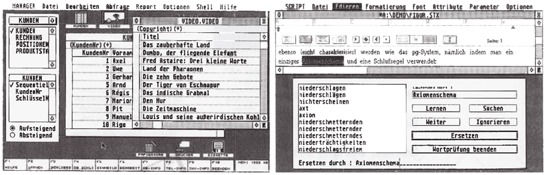 Start frei für eine neue Software-Leistungsklasse: Die Hardcopy unten zeigt Phoenix, den potentiellen Datenbank-Spitzenreiter von morgen. Auf der rechten Seite sehen Sie den neuen Rechtschreibprüfer der Textverarbeitung Script 2 in voller Aktion.