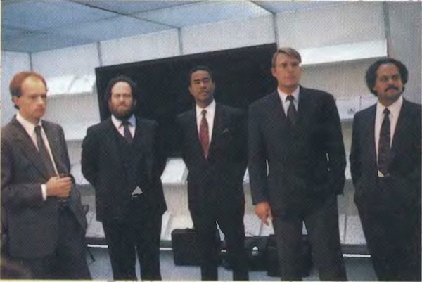 Entwickler-Prominenz: Ex-Atari-Entwicklungschef Shiraz Shivji [unten] und Atari Entwicklungschef Richard Miller [oben]. Das Bild ganz oben zeigt die Atari-Führungsspitze, ganz unten sehen Sie TOS-Chefredakteur Horst Brandl mit Shiraz Shivji und John F. Rizzo.