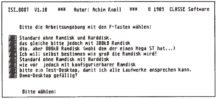 Unter der Bezeichnung »Starter-Kit« bietet der ABAC München, bekannt als Vertreiber der Datenbanksoftware »dBMAN« und des »ISI-Interpreters«, die nach eigenen Angaben »wichtigsten und besten Public-Domain-Utilities an, die derzeit für einen problemlosen Start des Atari ST erhältlich sind«. Dahinter steckt nichts anderes als eine Zusammenstellung von PD-Utilities und ein Bootwählprogramm, mit dem Sie sich nach einem Reset aus den Programmen Ihre individuelle Konfiguration zusammenstellen.