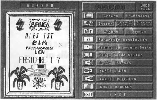 Grußkarten, DIN-A4-Prospekte und Plakate entwerfen und drucken Sie mit dem Programm »Fastcard«. Ähnlich wie beim legendären »Printmaster« bauen Sie die Vorlage auf dem Bildschirm aus Text und Grafiken auf. Dabei können Sie sämtliche Signum- undScript-Zeichen Sätze verwenden und Printmaster-Vorlagen übernehmen. Der Ausdruck erfolgt vorläufig nur auf 9-Nadel-Druckern. Fastcard kostet 69 Mark.