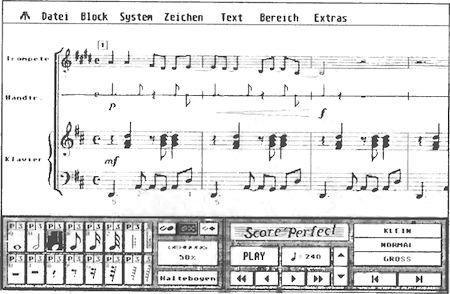Für alle Atari STs ab 1 MByte RAM bietet Soft Arts zwei Programme für qualitativ hochwertigen Notensatz bis 360 dpi an. Die Eingabe erfolgt wahlweise mit der Maus am Bildschirm, durch ein angeschlossenes MIDI-Keyboard oder durch Song-Dateien im MIDI-Standard-File-Format. »Score Perfect 1.2« bietet acht Notensysteme, Halte-und Legatobögen, Dynamik- und Sonderzeichen, eine Mix-Funktion zur polyphonen Darstellung innerhalb eines Notensystems sowie eine Funktion zum Speichern des Notenbildes im Signum- oder Calamus-Format. Das Programm läßt sich auch als Sequenzer verwenden. Die Professional-Version 1.0 arbeitet mit 32 Notensystemen und bietet zusätzlich halbautomatische Legatobögen, transponierbare Systeme, eine Notenlinie für Schlagzeugspuren, manuelle Editierfunktionen und mehrere einstellbare Seitenformate. Score-Perfect 1.2 kostet 199 Mark, die Professional-Version 348 Mark.