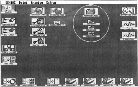 Die bekanntesten Alternativ-Desktops sind »Desa-Shell«, »Gemini« und »Neodesk«. Sowohl nach ihrem Leistungsvermögen als auch der Installationsfreundlichkeit unterscheiden sie sich ganz erheblich. Das im Bild gezeigte Desktop entstand mit »Gemini«. Es zeigt am linken und unteren Rand die Pictogramme für Laufwerk, Festplattenpartitionen, Klemmbrett, Papierkorb und Reißwolf. Außerdem sind hier die Programmicons für Gemini (Start und Ende) sowie zwei öfter benötigte Hilfsprogramme (Kopieren und Packen/Entpacken) untergebracht. Klemmbrett, Papierkorb und Reißwolf sind typisch für Gemini. Im Klemmbrett lassen sich Programme, Applikationen oder Dateien ablegen. Der Papierkorb unterscheidet sich vom Original-Atari-Papierkorb dadurch, daß sein Inhalt erhalten bleibt, d. h. dorthin gelöschte Daten lassen sich wieder herstellen. Der Reißwolf ist ein echter Aktenvernichter. Was dort landet, ist für immer verloren.