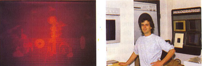 Das Bild links zeigt das mit Hilfe des Atari ST und der Cyber-Studio-Software produzierte Animations-Hologramm. Rechts: Ulrich Roth, der Partner des Holographie-Tüftlers Detlev Abendroth.