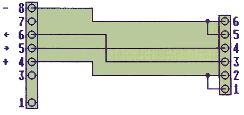 Auf dem Schaltplan ist links der Stecker des Atari 1040 ST abgebildet. Dieser befindet sich auf der Computerplatine selbst. Der rechte Stecker auf dem Bild stellt den Anschluß der Mega-ST-Tastatur dar, er wird als amerikanischer Telefonstecker oder auch Western-Stecker bezeichnet. Pin 1 des 1040 ST ist durch einen fehlenden Pin abgesetzt.