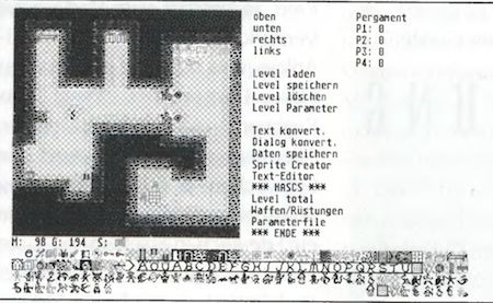 Mit einem Editor bearbeiten Sie die einzelnen Spielebenen, für deren Gestaltung zahlreiche Sprites zur Verfügung stehen. Wem diese Auswahl nicht genügt, der findet genug Freiraum für eigene Monster, Gegenstände etc. Jedes Sprite gehorcht eigenen Regeln. So läßt sich für jeden vom Computer gesteuerten Charakter dessen Verhalten gegenüber dem Spieler festlegen. Die Raumaufteilung erinnert stark an die ersten Teile von »Ultima«, und auch die Bewegungsabläufe deuten auf enge Verwandtschaft hin. Auch die Textgestaltung eines Adventures steuert »HASCS« fast automatisch - tippen müssen Sie selber. Ein Beispielabenteuer macht den angehenden Autor mit der Materie vertraut; Hinweise parallel dazu im Handbuch geben den nötigen Durchblick. Trotz der Einfachheit des Programms lassen sich komplexe Adventures entwickeln. Dabei sind keine Kenntnisse von Programmiersprachen erforderlich. Die fertigen Rollenspiele starten Sie über ein »Run-Only«, das Sie zusammen mit Ihren Spielen weitergeben dürfen. (ah)