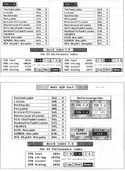 Das NVDI-Accessory besitzt vier Schalter, um das GDOS, die GEM-DOS-Zeichenausgabe und einen Mausbeschleuniger ein- oder auszuschalten. Um eventuell auftretende Inkompatibilitäten zu ermitteln, ist der Schalter »Fehlerkompatibilität« installiert. Danach behandelt das NVDI einige VDI-Be-fehle wieder konform zum Atari-VDI, sodaß Sie die Ursache eines möglichen Fehlers leichter ermitteln können. Das ausführliche Handbuch geht auf die genaue Vorgehensweise und eventuelle Probleme ein und erläutert auch alle VDI-Befehle. Ein beigefügtes Installationsprogramm erleichtert das Kopieren der notwendigen Dateien auf die gewünschte Festplattenpartition. Zum Lieferumfang gehört noch ein kleines Testprogramm, um die Geschwindigkeitssteigerung zu messen. Mit diesem Programm sowie dem »Quick Index 1.8« sind auch die beiden Bilder entstanden. An der Schriftart erkennen Sie ein Beispiel für einen anderen Systemzeichensatz.
