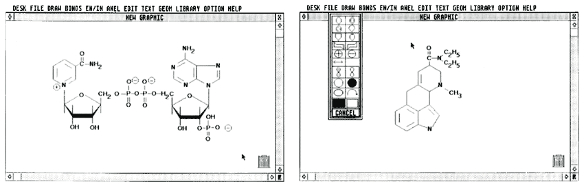 Ein weiteres Programm zum Zeichnen chemischer Strukturformeln ist »Chemograph plus 4.31«. Zum Lieferumfang gehören acht Disketten sowie ein DIN-A4-Ringordner, der ein 90 Seiten umfassendes Handbuch enthält. Alle Zeichenfunktionen rufen Sie bei Chemograph über insgesamt elf Pull-Down-Menüs sowie ein Pop-Up-Menü auf (Bild 3 und 4). Das Pop-Up-Menü enthält gängige chemische Grafikelemente, die man mit der Maus aktiviert. Alle Zeichenfunktionen sind auch über Tastaturkommandos zu erreichen. Zum Programm gehört eine umfangreiche Struktursammlung, deren Moleküle in einigen Fällen leider der Nachbearbeitung bedürfen. Trotzdem sind die auf Tastendruck erreichbaren Fragmente eine wesentliche Zeichenhilfe.