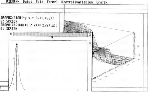 Ein Kritikpunkt von der alten Version von Riemann war, daß es keinen angemessenen Funktionsplotter besaß. Dies hat sich in Riemann II gründlich geändert. Über die zwei Befehle »GRAPH« (2D-Grafik) und »GRAPH3« (3D-Grafik) erzeugt das Programm ansprechende Funktionsgraphen (siehe Bild 3). Dabei verwendet Riemann vorbildlicherweise die Vektorgrafik des GEM-VDI. Somit sind die erzeugten Grafiken geräteunabhängig und lassen sich problemlos und in hervorragender Qualität auf einem Drucker oder in einem Metafile ausgeben. Über Dialogboxen oder Funktionen steuern Sie das Aussehen der Grafik: So wählen Sie die Bemaßung (linear oder logarithmisch), die Achsenbeschriftung und die Skalierung. Bei den 3D-Grafiken schalten Sie auf Wunsch noch eine Beleuchtung der Graphen hinzu und bestimmen die gewünschte Schattierung der Flächen.